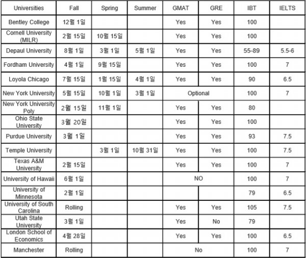 TOEFL 은 section 별로 minimum score 를 요구하는 학교도 있고, Ph.D. 과정을 위한 리서치 위주의 MS 과정중에는 writing sample 을 요구하는 곳도 있습니다. GMAT, GRE 를 모두 받지만 둘중 하나를 선호한다고 명시한 과정도 있습니다.