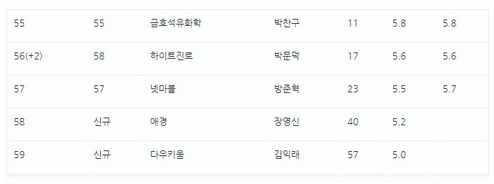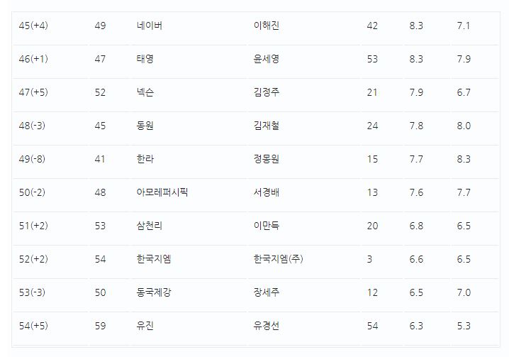 거의 변동이 없는 1위~9위, 한화가 지에스를 넘어선것이 이슈, 사업포트폴리오의 차이?
