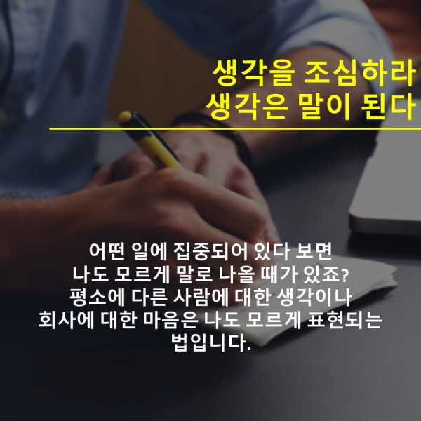 [경력직좋은글] 생각을 조심하라. 생각은 **이 된다!!!! 11,775 0 2 여러가지 노하우가 필요한 회사생활~ 회사생활에 필요한 정보를 얻는 시간을 줄여드리는 잡인덱스 오늘은 생각을 조심해야 하는 이유에 대한 좋은 글을 소개 해 드립니다. `19.10.29(updated. `20.04.11) 다음글애플, 에어팟 프로 출시…“가격 249달러, 색상은 화이트만” 이전글성공적인 이직을 위한 경력직 노하우 TOP5 비밀노트