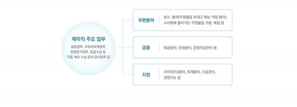 계리직이란 우체국의 창구 업무를 수행하는 분들을 떠올리시면 가장 쉽게 감을 잡으실 수 있습니다. 예, 적금 업무 및 우편의 접수 등도 모두 계리직의 업무 중 하나인데요. 직접 배달을 수행하시는 집배직과는 직렬이 다르기 때문에 다른 분야입니다.