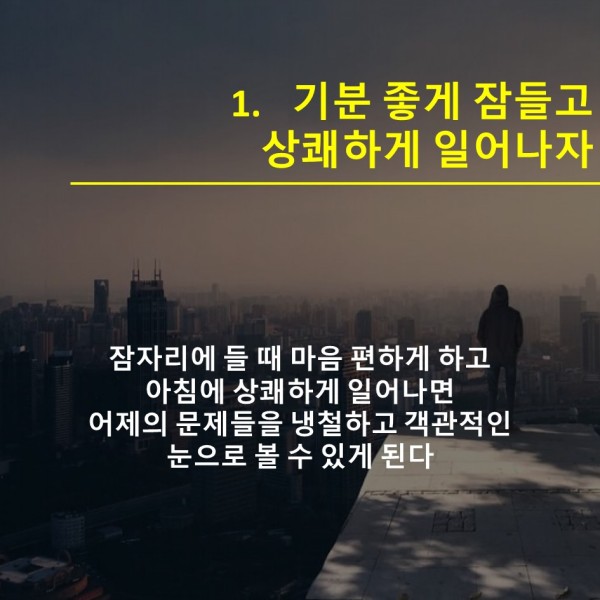 1. 기분 좋게 잠들고 상쾌하게 일어나자. 아침에는 전혀 다른 문제가 되어 있을테니
