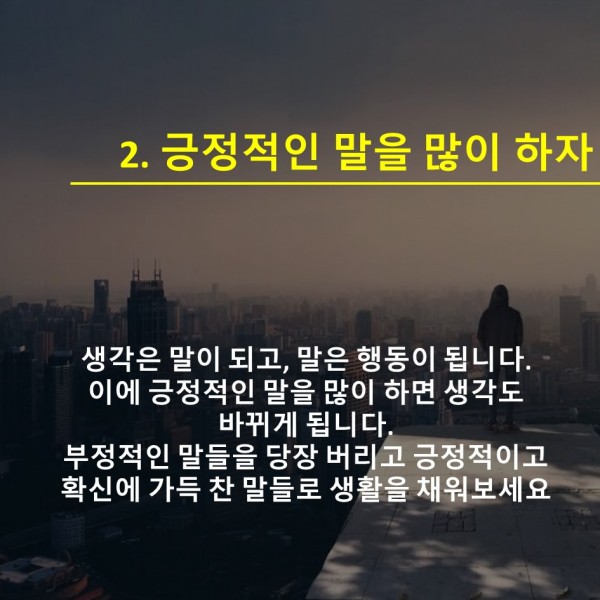 2. 긍정적인 말을 많이 하자. 생각은 말이되고 말은 행동이된다. 행동은 습관이 되고 습관은 운명이 된다!