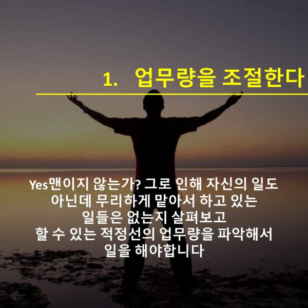 (1. 업무량을 조절한다 - 무조건 다하다보면 혼자 일하고 있다. 적당하게 끊을 줄 알아야 한다)