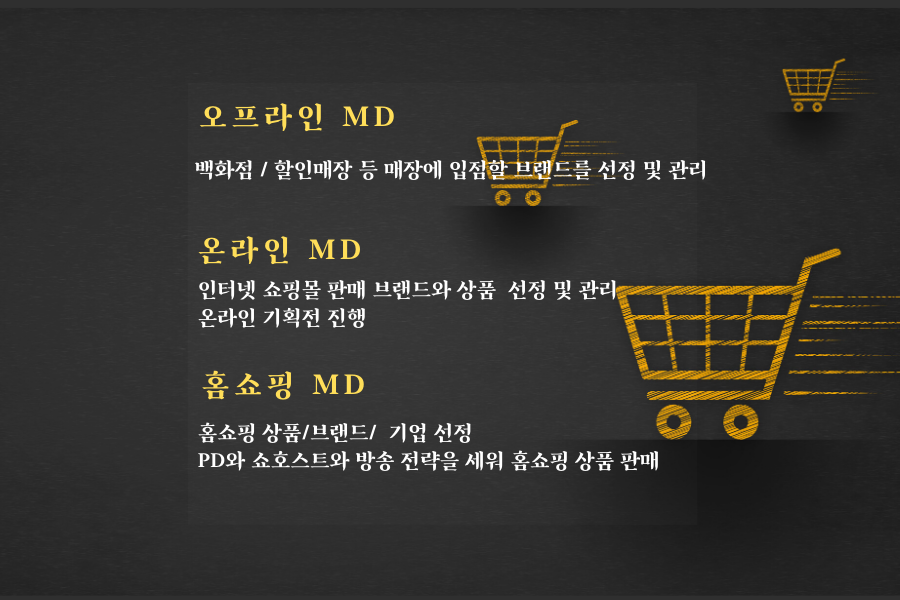 홈쇼핑 MD : GS홈쇼핑, CJ 홈쇼핑 등 홈쇼핑 채널에서 판매되는 상품 혹 브랜드를 선정 및 판매한는 역할 입니다.