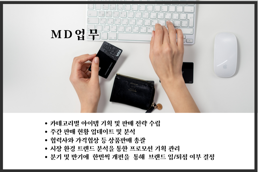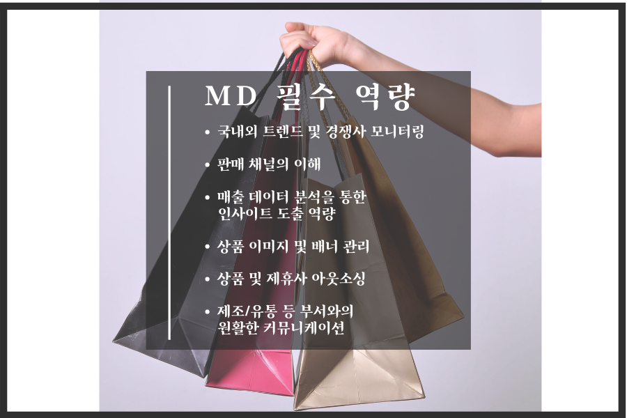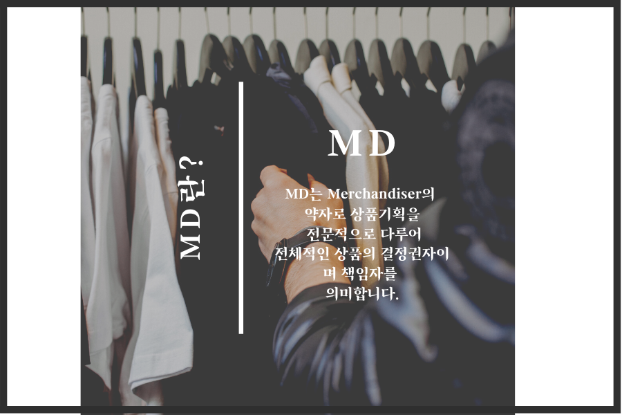 MD는 merchandiser의 약자로 상품 기획을 전문적으로 다루어 전체적인 상품의 결정권자이며 책임자 입니다.