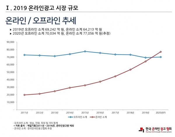 또한, 2020년에는 5G,AI ,빅데이터 등 4차산업의 고도화로 온라인 광고시장 규모 약 7조 7000억원으로 증가해 전체 광고시장의 절반이상을 차지할 것으로 전망됩니다.