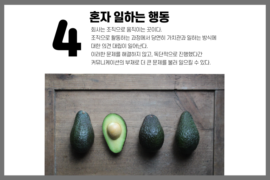 팀은 다양한 사람들로 구성되 저마다 성격, 성향, 일하는 방식 등 천차만별 다른데요. 이렇게, 여러사람으로 구성된 부서나 프로젝트 팀에서 독창적인 개인플레이를 할 경우 조직으로서의 방향성을 잃어버릴 수 있습니다.