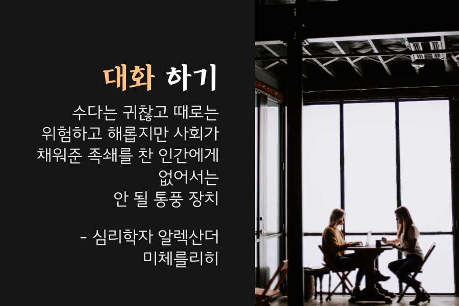 나를 잘 모르는 사람에게 내 감정을 솔직하게 표현하는 것만으로도 마음에 쌓인 응어리가 풀린 것 같은 시원함을 느낀 경험이 한번쯤은 있을 것이다. 누군가 내말을 들어줄 사람이 있어 속내를 솔직하게 털어놓는 대화 즉 수다의 힘이다.
