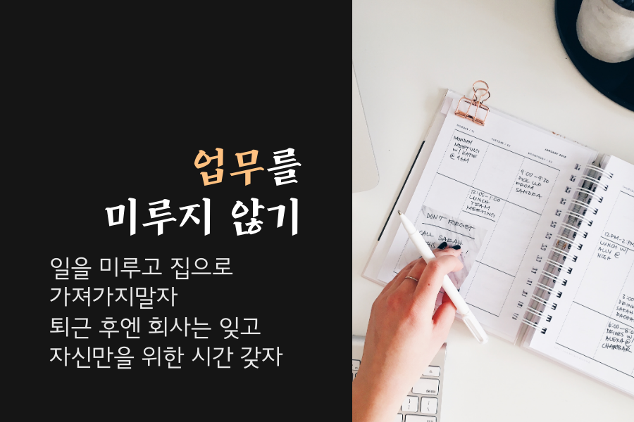 스스로 마감 기한 날짜를 정하고 되도록 업무 시간에 집중하여 일을 해결하자.