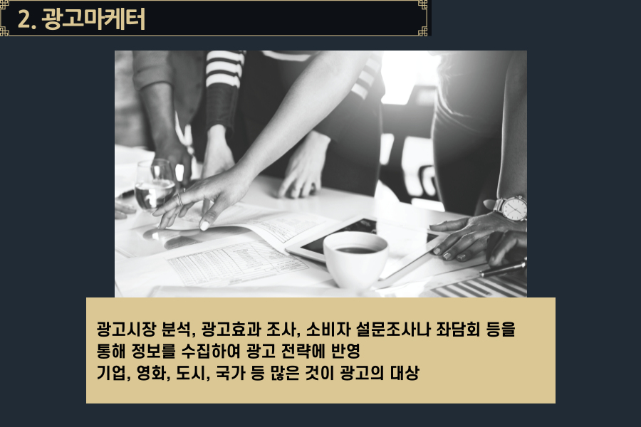 광고마케터는 광고회사 또는 기업체 내에서 광고시장 분석, 광고효과 조사, 소비자 설문조사나 좌담회 등을 통해 정보를 수집하여 광고 전략에 반영하는 사람입니다. 기업뿐만 아니라 영화, 도시, 국가 등 수많은 것이 광고의 대상이 되고 있습니다.