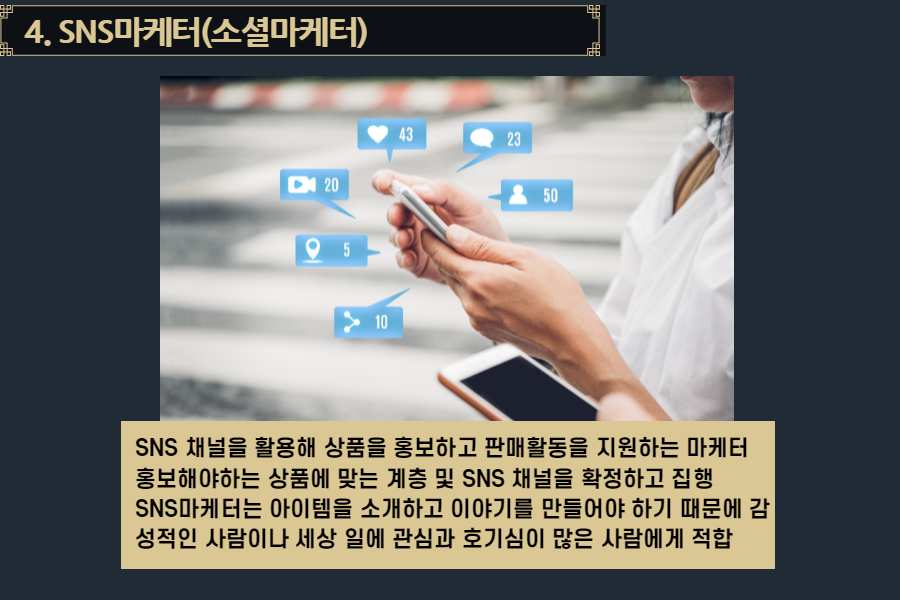 디지털 매체 중에서 페이스북, 인스타그램, 블로그, 유튜브와 같은 SNS 채널을 활용해 상품을 홍보하고 판매활동을 지원하는 마케터를 SNS마케터(소셜마케터)라고도 부릅니다. 홍보해야하는 상품에 맞는 계층(성, 연령, 직업군 등) 및 SNS 채널을 확정하고, 마케팅 계획을 세우고, 이를 집행하는 일을 하게 됩니다.
