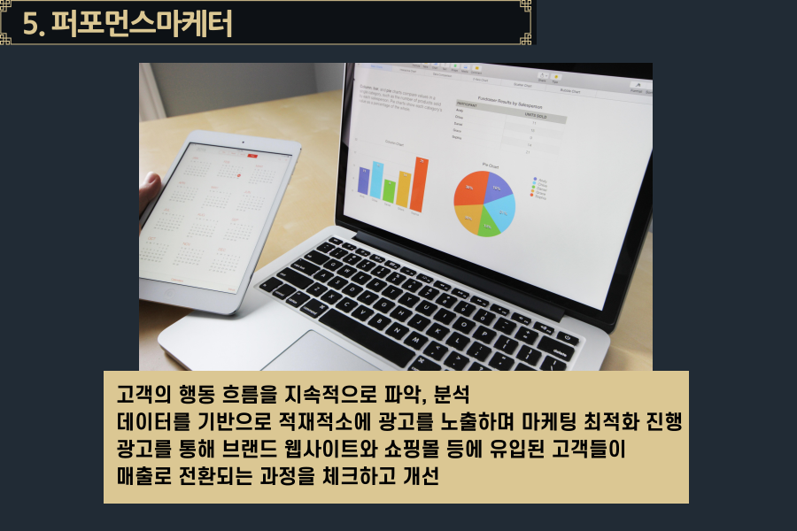 퍼포먼스마케터는 고객의 행동 흐름을 지속적으로 파악, 분석하고 데이터를 기반으로 적재적소에 광고를 노출하며 마케팅 최적화 진행 및 성과를 측정하는 일을 합니다. 온라인에서 다양한 경로로 커뮤니케이션 및 광고를 통해 브랜드 웹사이트와 쇼핑몰 등에 유입된 고객들이 매출로 전환되는 과정을 체크하고 개선하는 일을 하는 것이죠.