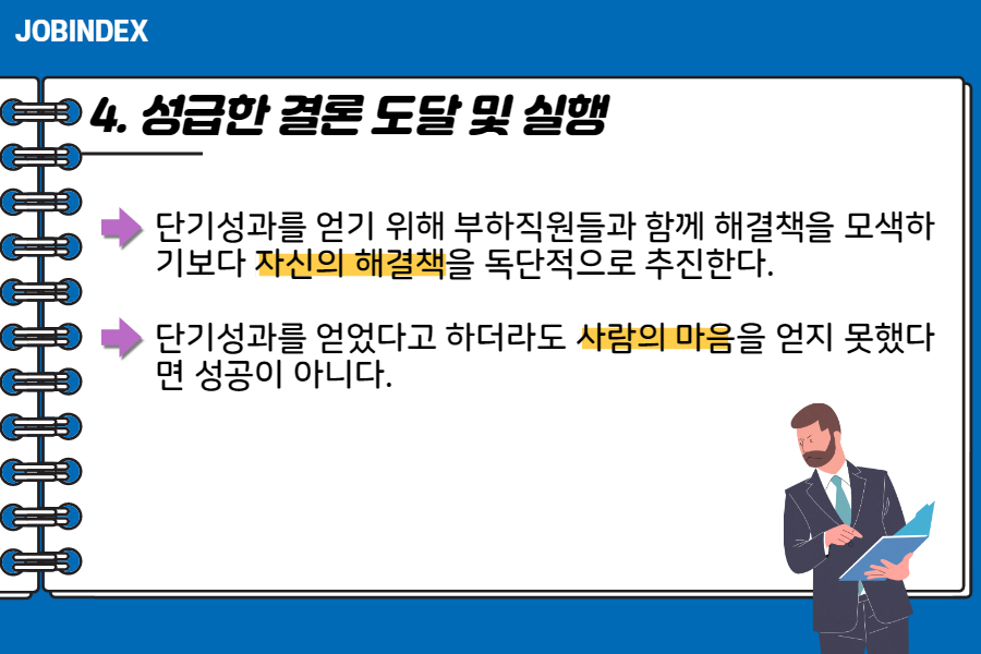 단기성과를 얻기 위해 부하직원들과 함께 해결책을 모색하기보다 자신의 해결책을 독단적으로 추진한다.