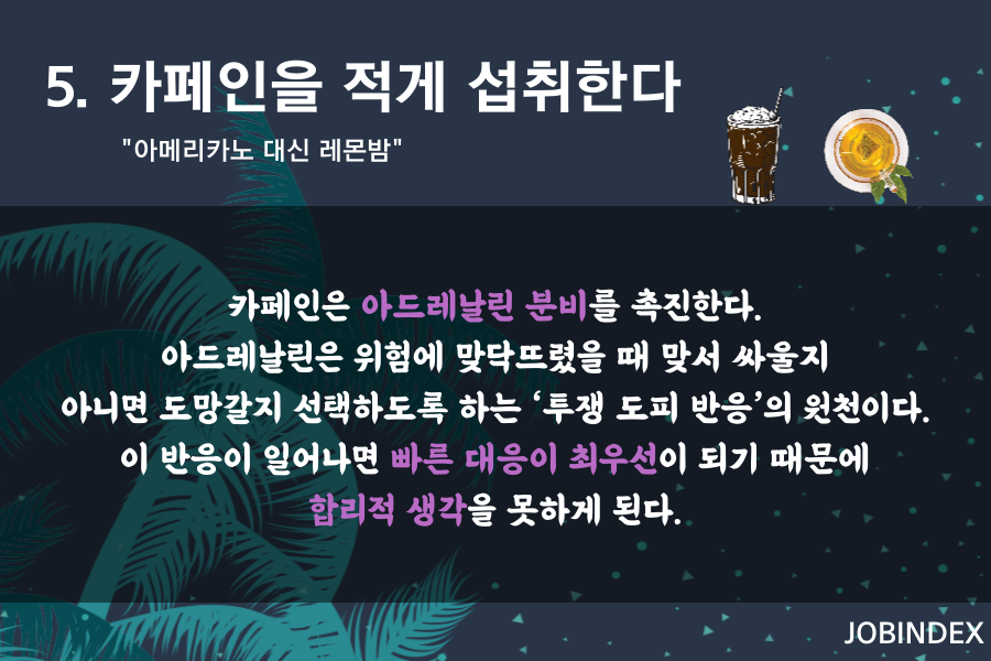 카페인은 아드레날린 분비를 촉진한다. 아드레날린은 위험에 맞닥뜨렸을 때 맞서 싸울지 아니면 도망갈지 선택하도록 하는 ‘투쟁 도피 반응’의 원천이다. 이 반응이 일어나면 빠른 대응이 최우선이 되기 때문에 합리적 생각을 못하게 된다.
