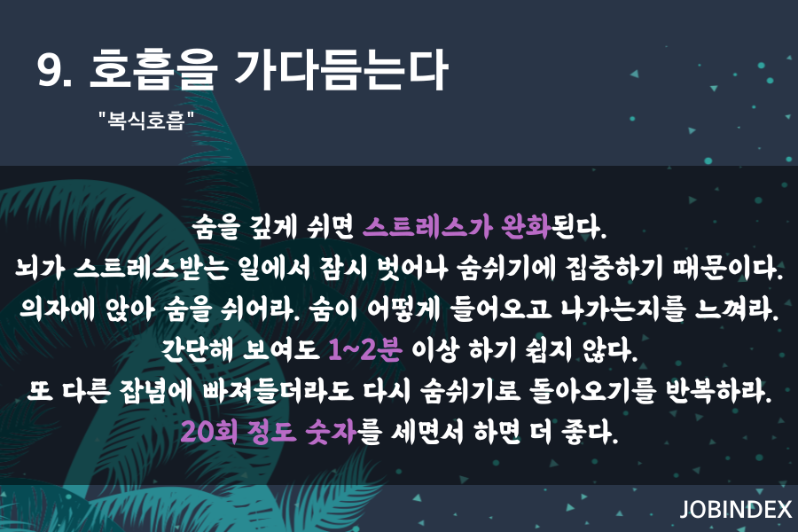숨을 깊게 쉬면 스트레스가 완화된다. 뇌가 스트레스받는 일에서 잠시 벗어나 숨쉬기에 집중하기 때문이다. 스트레스를 느낄 때 몇 분간 심호흡을 해라.