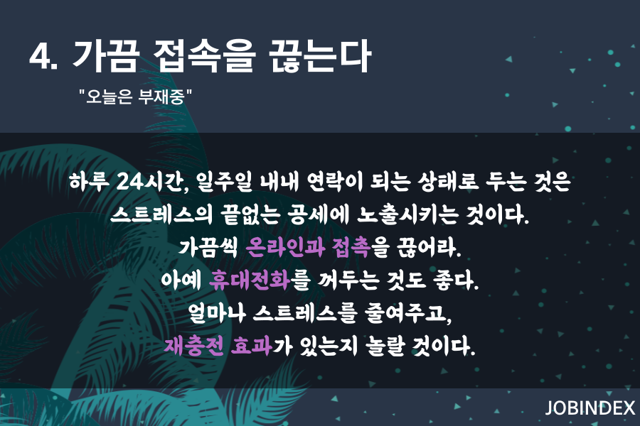 가끔씩 온라인과 접촉을 끊어라. 아예 휴대전화를 꺼두는 것도 좋다. 얼마나 스트레스를 줄여주고, 재충전 효과가 있는지 놀랄 것이다.