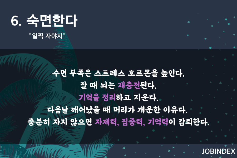 수면 부족은 스트레스 호르몬을 높인다. 잘 때 뇌는 재충전된다. 기억을 정리하고 지운다. 다음날 깨어났을 때 머리가 개운한 이유다.