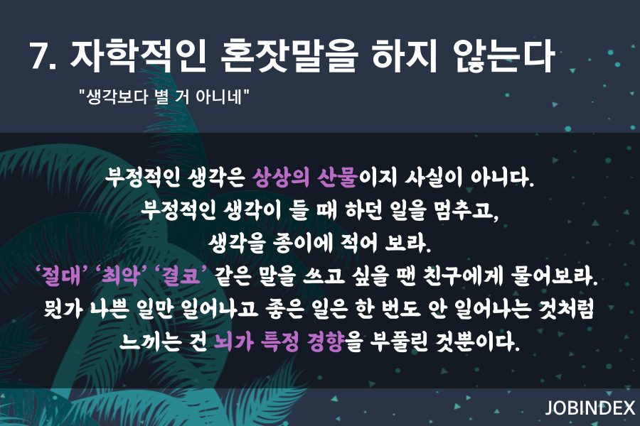 일이 잘 풀리지 않아 부정적인 생각으로 가득 찬다면 그날 있었던 일 중에 긍정적인 일 한 가지를 떠올려라. 아무리 사소한 것이어도 상관없다.