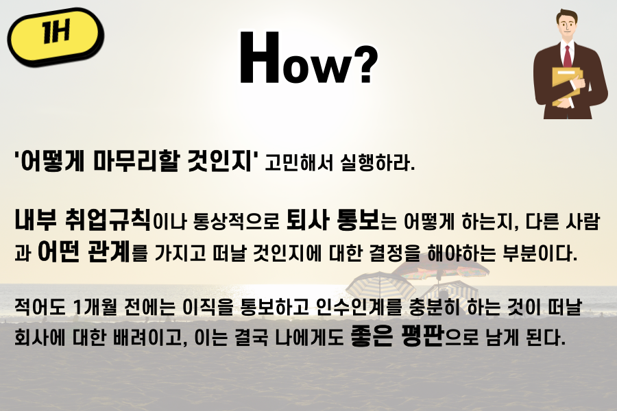 - 내부 취업규칙이나 통상적으로 퇴사 통보는 어떻게 하는지, 다른 사람과 어떤 관계를 가지고 떠날 것인지에 대한 결정을 해야하는 부분이다.