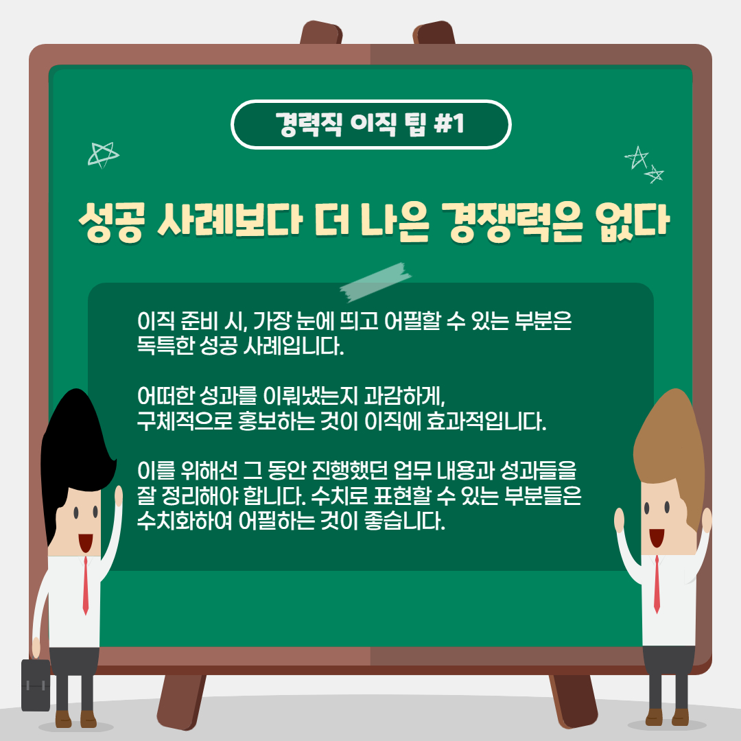 어떠한 성과를 이뤄냈는지 과감하게, 구체적으로 홍보하는 것이 이직에 효과적입니다.