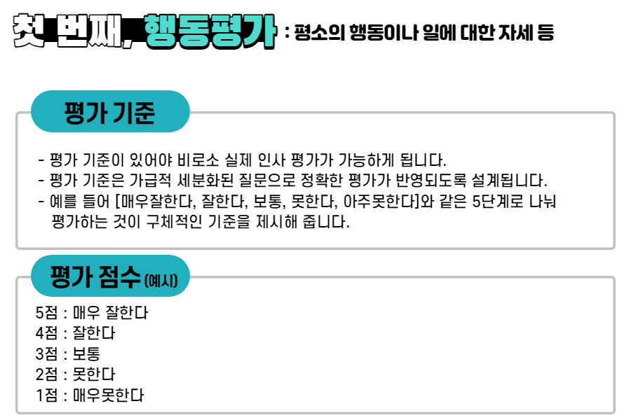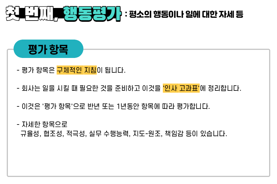 첫 번째, 평소의 행동이나 일에 대한 자세 등을 보는 '행동평가'