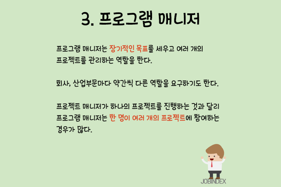 프로젝트 매니저가 하나의 프로젝트를 진행하는 것과 달리 프로그램 매니저는 한 명이 여러 개의 프로젝트에 참여하는 경우가 많다.
