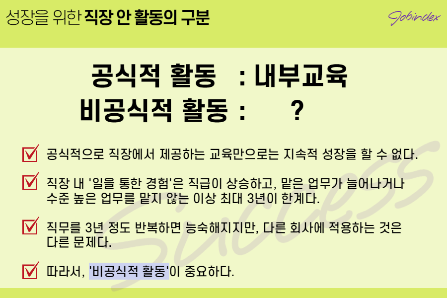 => 공식적으로 직장에서 제공하는 교육만으로는 지속적 성장을 할 수 없다.