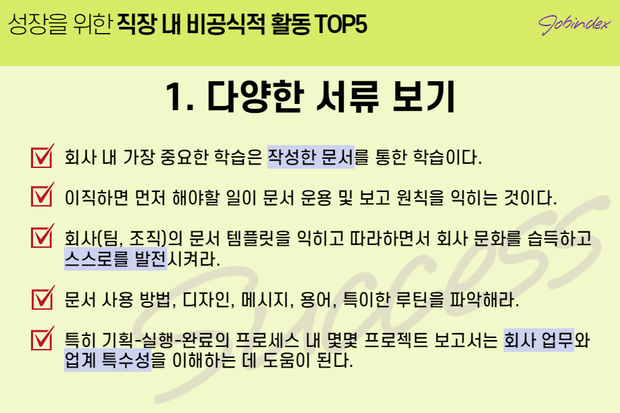 회사(팀, 조직)의 문서 템플릿을 익히고 따라하면서 회사 문화를 습득하고 스스로를 발전시켜라.