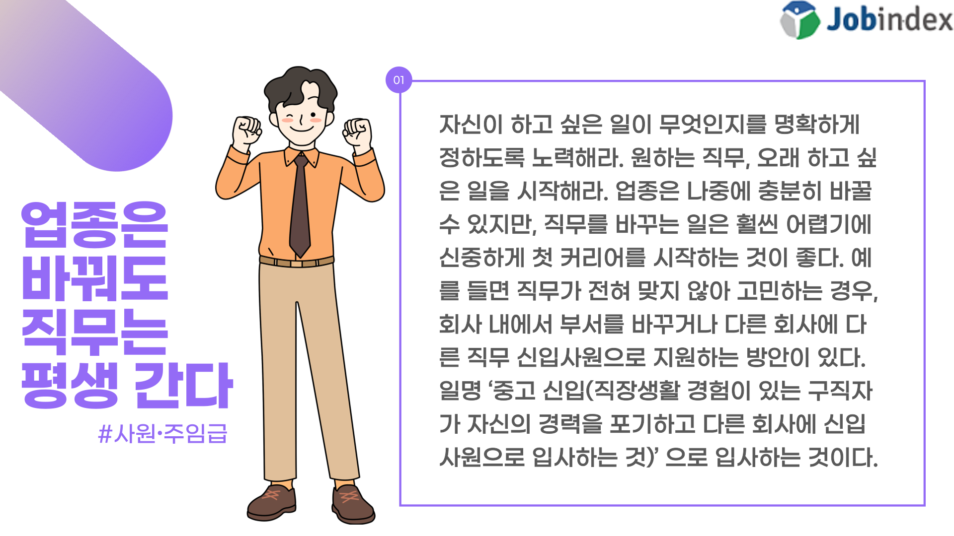 원하는 직무, 오래 하고 싶은 일을 시작해라. 업종은 나중에 충분히 바꿀 수 있지만, 직무를 바꾸는 일은 훨씬 어렵기에 신중하게 첫 커리어를 시작하는 것이 좋다. 예를 들면 직무가 전혀 맞지 않아 고민하는 경우, 회사 내에서 부서를 바꾸거나 다른 회사에 다른 직무 신입사원으로 지원하는 방안이 있다. 일명 ‘중고 신입’ 으로 입사하는 것이다.