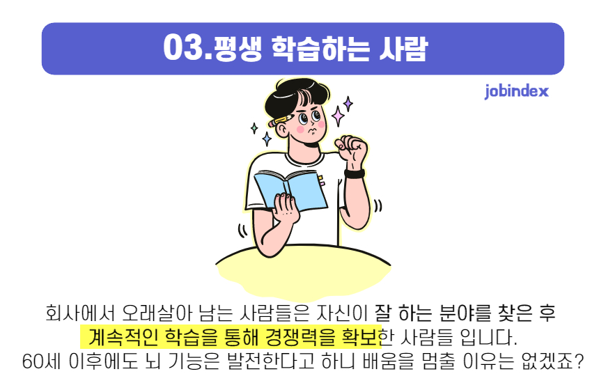 회사에서 오래살아 남는 사람들은 자신이 잘 하는 분야를 찾은 후 계속적인 학습을 통해 경쟁력을 확보한 사람들이다. 60세 이후에도 뇌기능은 발전한다고 하니 ^^ 배움을 멈출 이유는 없는 거겠죠?