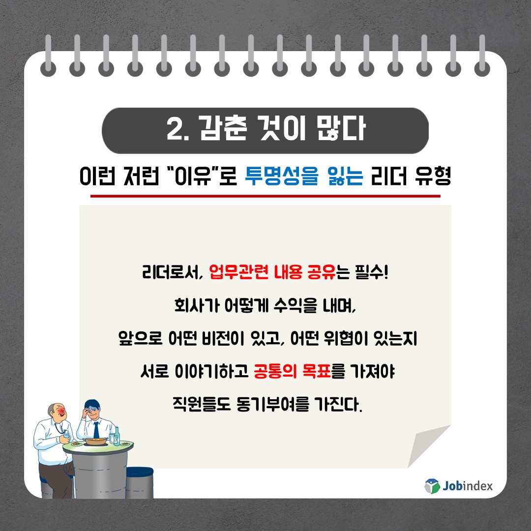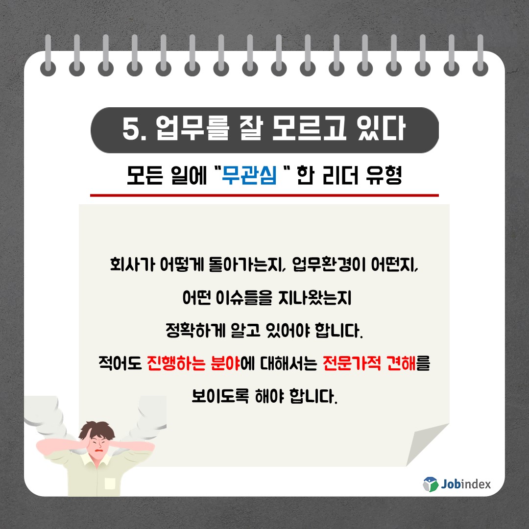 회사가 어떻게 돌아가는지, 지금 업무환경이 어떤지, 어떤 이슈들을 지나왔는지 직원과 함께 하지 않는리더들은 직원들의 사기를 떨어뜨리는 "적군"보다 무서운 법이랍니다. 적어도 진행 하는 분야에 대해서는 전문가적 견해를 보이도록 해야 한답니다