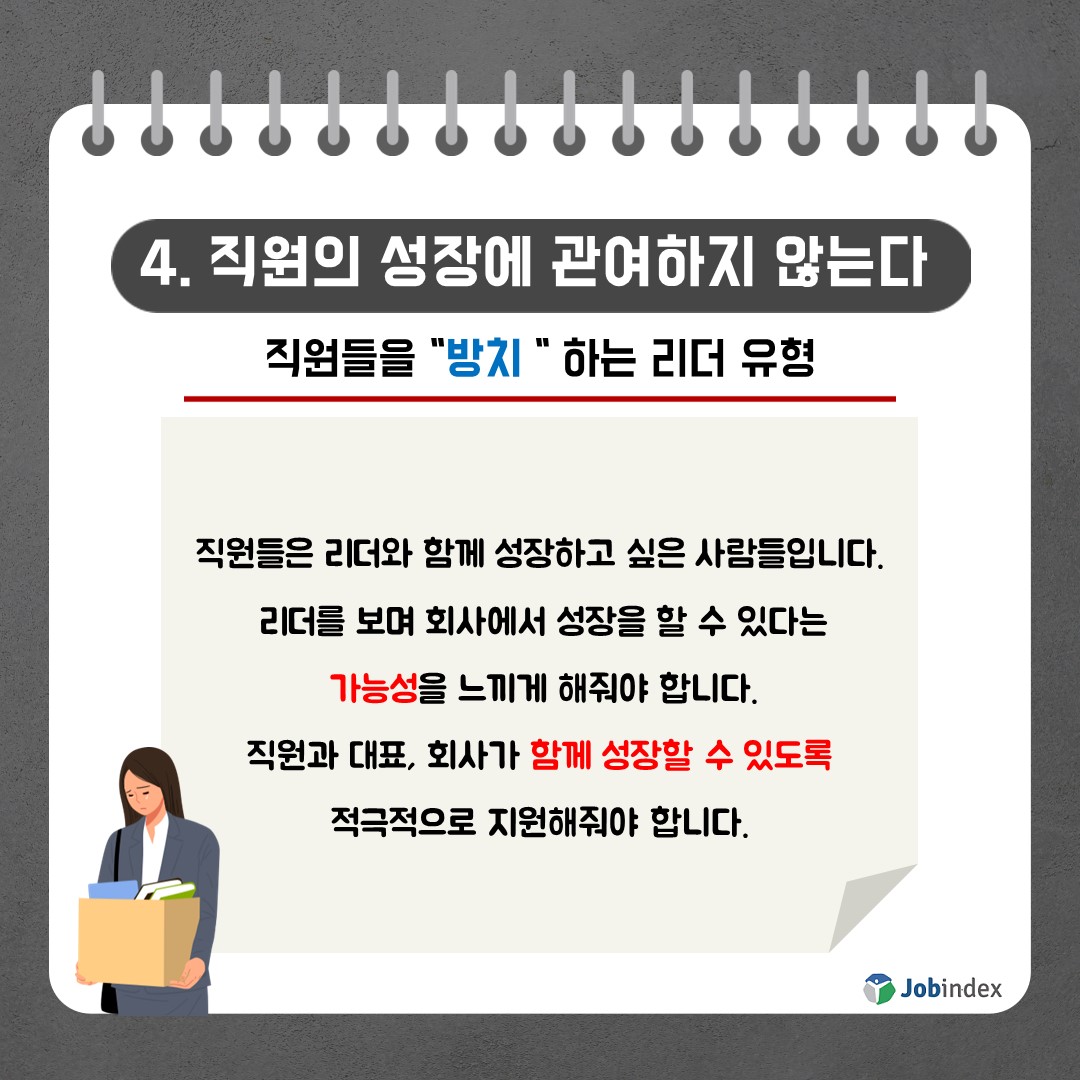 직원들은 리더와 함께 성장하고 싶은 사람들이랍니다. 리더가 모범을 보이고, 여기서 무언가 성장을 할 수 있다는 여지를 계속 보여줘야 합니다. 직원 한명 한명이 분야의 전문가로 성장하고 있다는 느낌을 가져야 "방치" 되었다는 느낌을 받지 않는답니다.