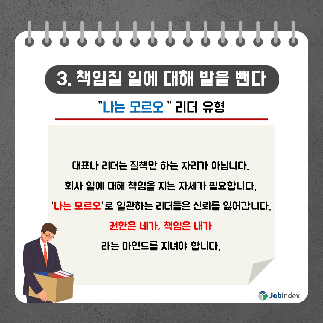 대표나 리더는 질책만 하는 자리가 아니랍니다. 진행하는 일에 대해 목표를 설정하고 그 목표를 향해 가는 길에 일어난 일들(보고 받은 일들에 대해) 책임을 지는 자세가 필요합니다. "나는 모르오" 로 일관하는 리더들은 신뢰를 잃어가고 있다는 것을 잊지 마세요!