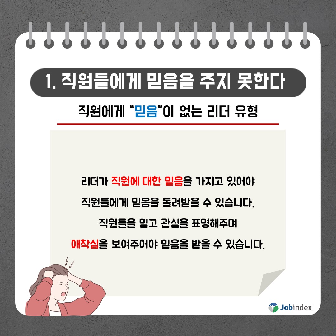 리더가 직원에 대한 믿음을 가지고 있어야 돌려받을 수 있습니다. 실제 직장인에 50%이상이 항상 이직을 생각하고 있답니다. 이런 직원들을 믿고 관심을 표명해주어 반대로 직원들에 대한 애착심을 보여주어야 리더가 반대로 믿음을 받을 수 있답니다.