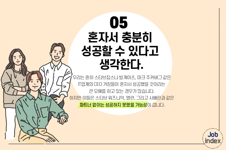 우리는 흔히 스티브잡스나 빌게이츠, 마크 주커버그 같은 IT업계의 CEO 거장들이 혼자서 성공했을 것이라는 큰 오해를 하고 있는 경우가 많습니다. 하지만 이들은 스티브 워즈니악, 앨런, 그리고 사베린과 같은 파트너 없이는 성공하지 못했을 가능성이 큽니다. 예를 들어서 아무리 천재 영화배우라도 조연배우들과 스태프, 감독 및 뛰어난 대본 등이 없다면 그 영화는 흥행할 수가 없습니다. 항상 누군가와 같이 성공의 길을 걸을 생각을 하는 것이 좋습니다.