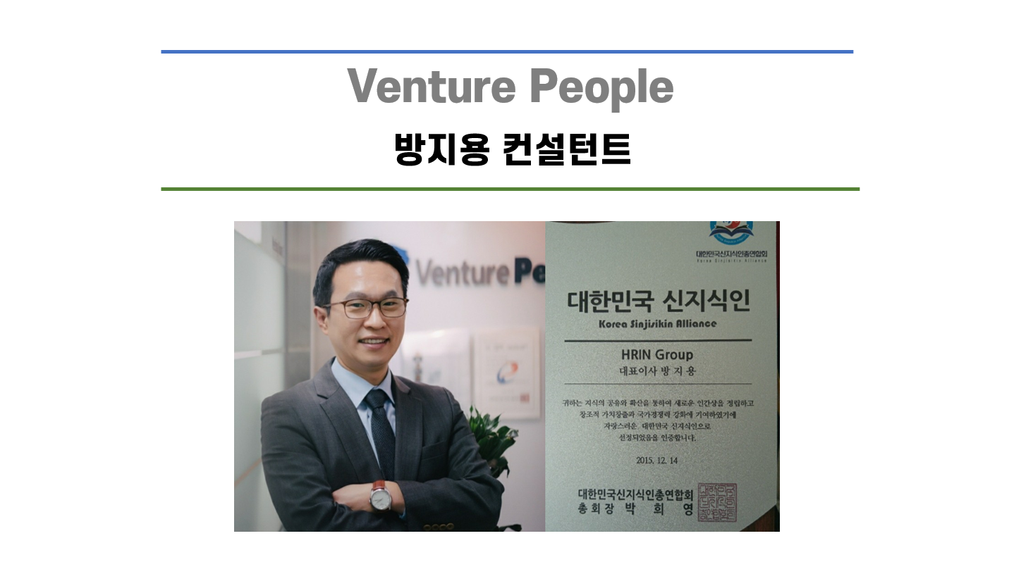 벤처피플 방지용 전무는 2003년부터 헤드헌팅을 시작해, 15년 가까이 국내 최대 서치펌인 유니코써치, 다국적 회사인 MRI Worldwide(전 세계 40여개 나라 1000여개 오피스 운영하고 있는 다국적 헤드헌팅회사, 2009-2011년 3년 연속 아시아 Top 3 & 전세계(Global 전체 3위) All Start 선정)에서 산업 팀 총괄 본부장과 HRI Worldwide/HRIN Group 대표 거쳐왔다. 핵심 인재 및 C-Level 포지션과 중요 포지션에서 다수의 성공 경험을 보유한 방지용 전무의 이야기를 들어보자.