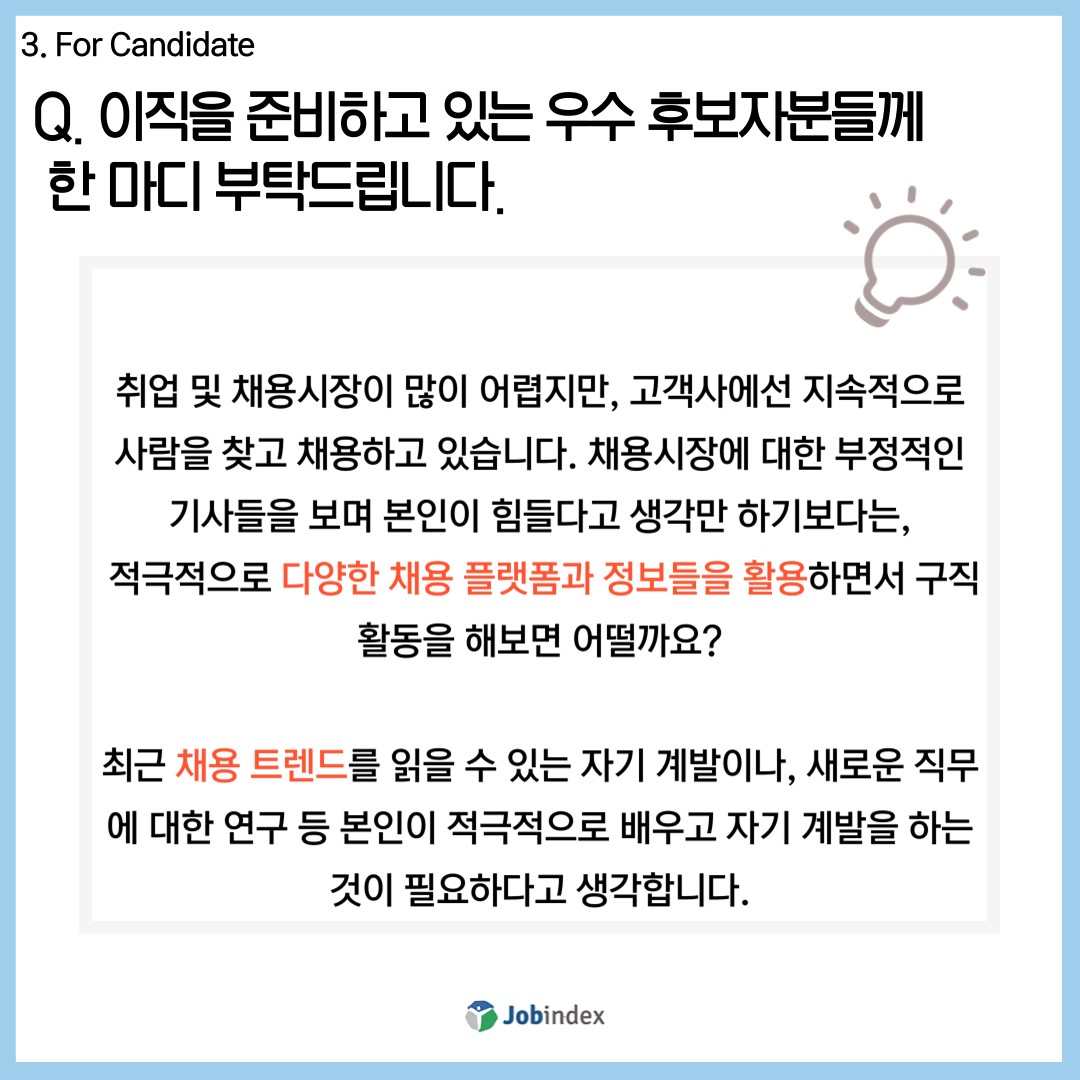 Q. 이직을 준비하고 있는 우수 후보자분들께 한 마디 부탁드립니다.