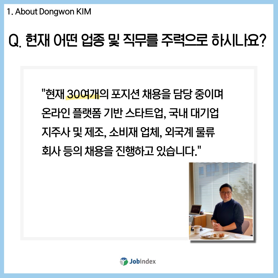 A. 현재 30여개의 포지션 채용을 담당 중이며 온라인 플랫폼 기반 스타트업, 국내 대기업 지주사 및 제조, 소비재 업체, 외국계 물류 회사 등의 채용을 진행하고 있습니다.