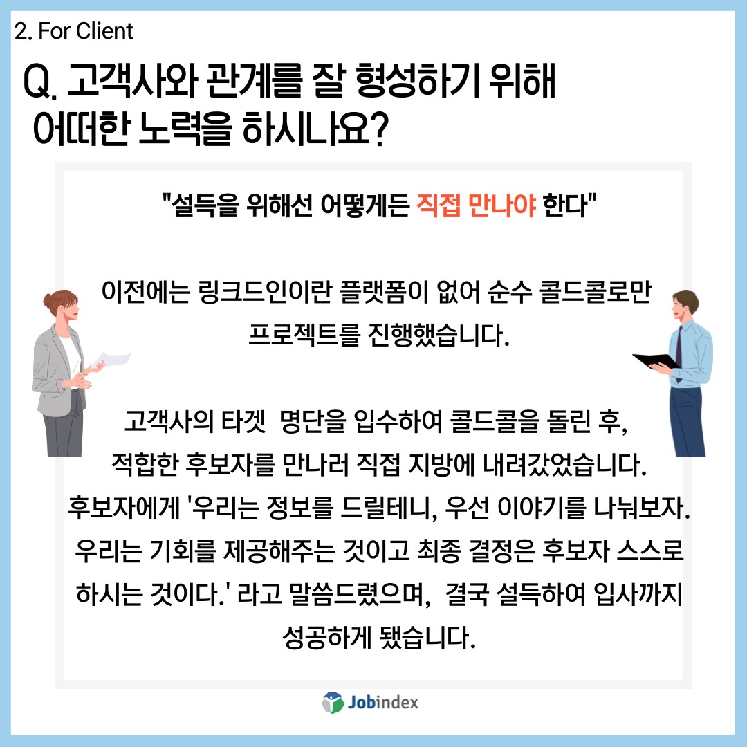 회사 내부 정보, 해당 포지션의 구체적인 R&R 등 후보자 입장에서 궁금한 것들을 고객사와의 커뮤니케이션을 통해 파악하고 후보자의 니즈를 해소하는게 제 노하우입니다.