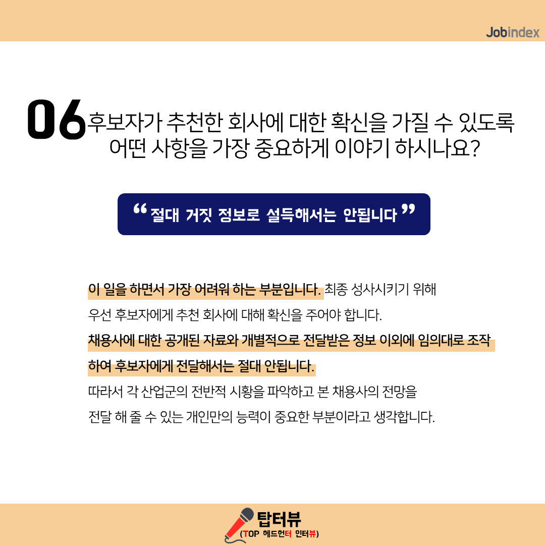 06. 후보자가 추천한 회사에 대한 확신을 가질 수 있도록 어떤 사항을 가장 중요하게 이야기 하시나요?