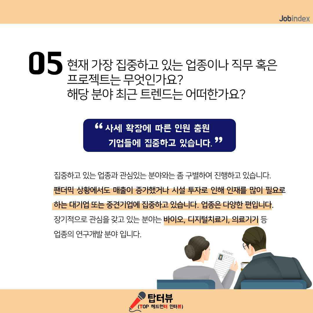 - 집중하고 있는 업종과 관심있는 분야와는 좀 구별하여 진행하고 있습니다. 팬더믹 상황에서도 매출이 증가했거나 시설 투자로 인해 인재를 많이 필요로 하는 대기업 또는 중견기업에 집중하고 있습니다. 업종은 다양한 편입니다. 장기적으로 관심을 갖고 있는 분야는 바이오, 디지털치료기, 의료기기 등 업종의 연구개발 분야 입니다.