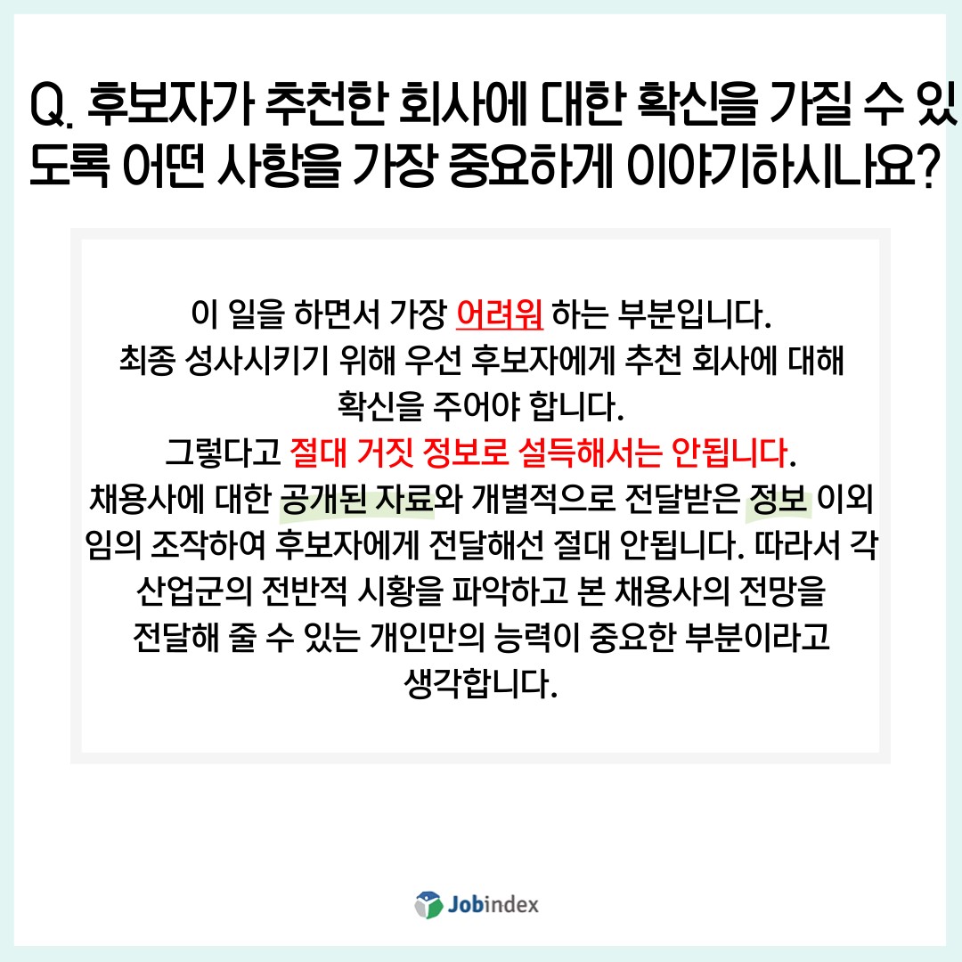 Q. 후보자가 추천한 회사에 대한 확신을 가질 수 있도록 어떤 사항을 가장 중요하게 이야기하시나요?