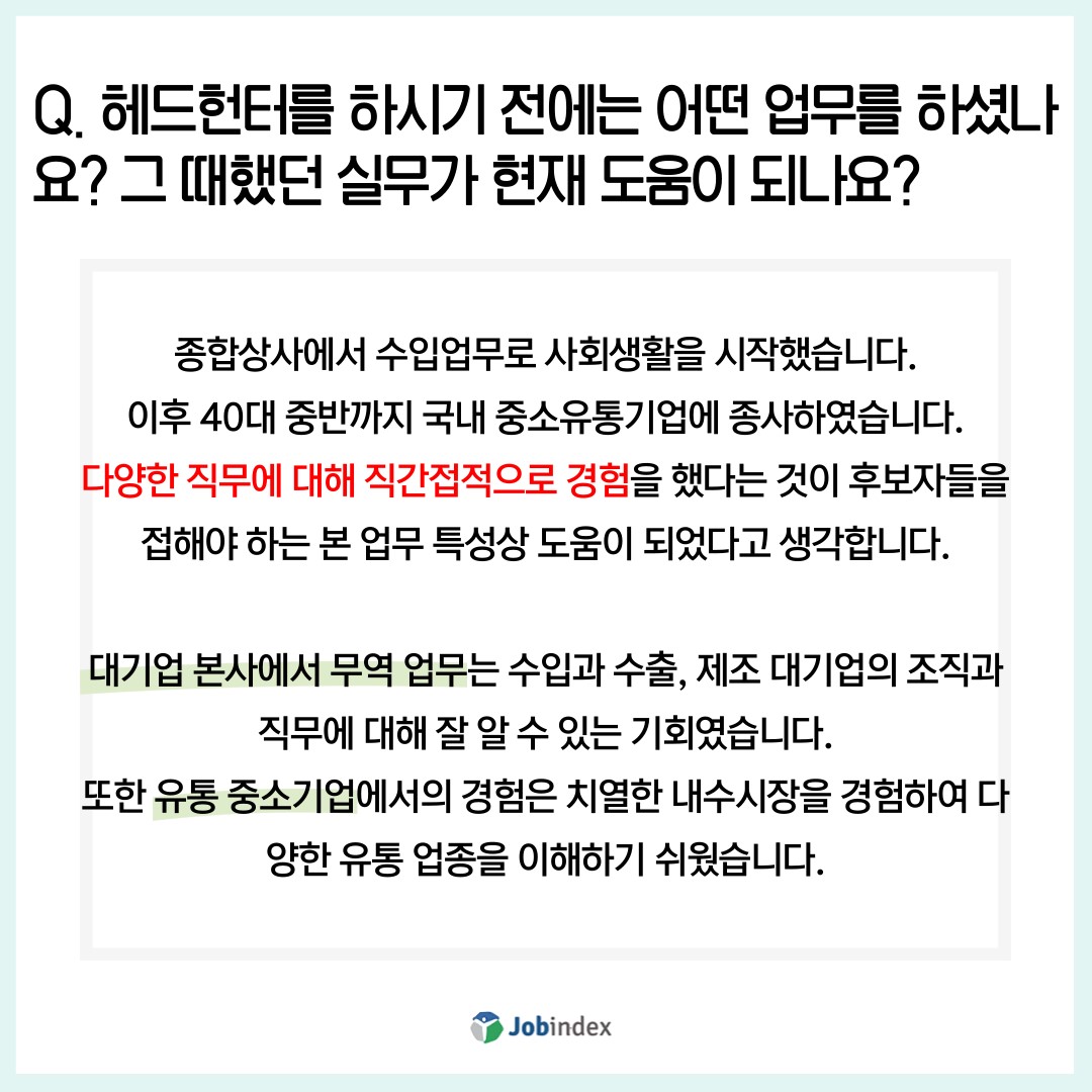 Q. 헤드헌터를 하시기 전에는 어떤 업무를 하셨나요? 그때했던 실무가 현재 도움이 되나요?