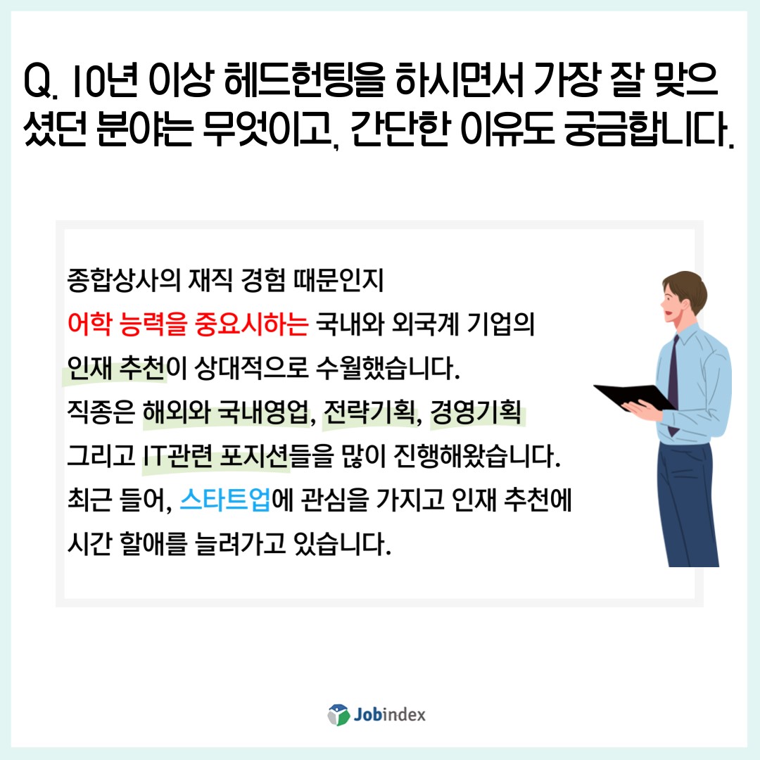 Q. 10년이상 헤드헌팅을 하시면서 가장 잘 맞으셨던 분야는 무엇이고, 간단한 이유도 궁금합니다.