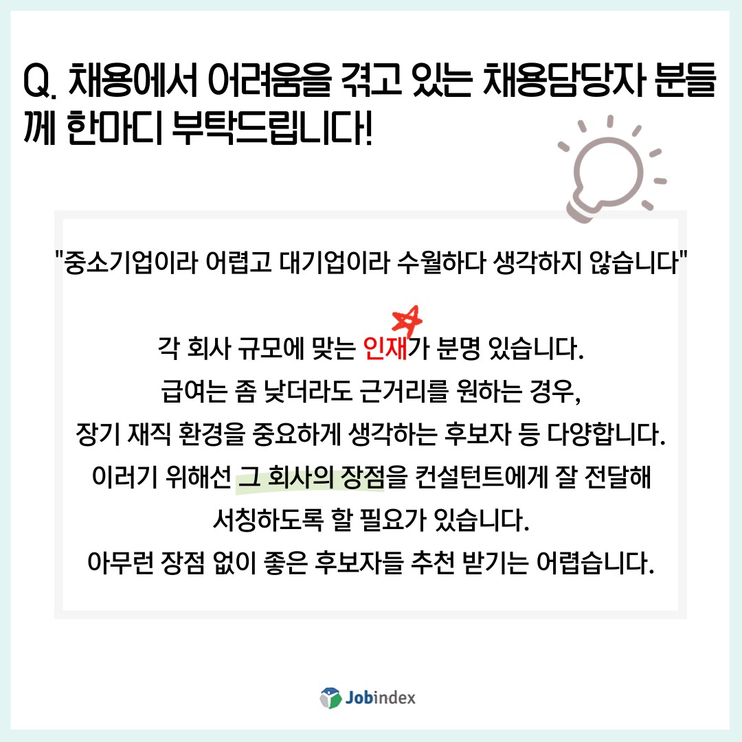 A. 중소기업이라 어렵고 대기업이라 수월하다 생각하지 않습니다. 각 회사 규모에 맞는 인재가 분명 있습니다. 급여는 좀 낮더라도 근거리를 원하는 경우, 장기 재직 환경을 중요하게 생각하는 후보자 등 다양합니다. 이러기 위해선 그 회사의 장점을 컨설턴트에게 잘 전달해 서칭하도록 할 필요가 있습니다. 아무런 장점 없이 좋은 후보자들 추천 받기는 어렵습니다.