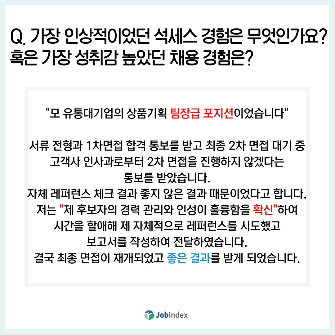 A. 모 유통대기업의 상품기획 팀장급 포지션이었습니다. 서류전형과 1차면접 합격 통보를 받고 최종 2차 면접 대기 중 고객사 인사과로부터 2차 면접을 진행하지 않겠다는 통보를 받았습니다. 자체 레퍼런스 체크 결과 좋지 않은 결과 때문이었다고 합니다. 저는 "제 후보자의 경력 관리와 인성이 훌륭함을 확신"하여 시간을 할애해 제 자체적으로 레퍼런스를 시도했고 보고서를 작성하여 전달하였습니다. 결국 최종 면접이 재개되었고 좋은 결과를 받게 되었습니다.