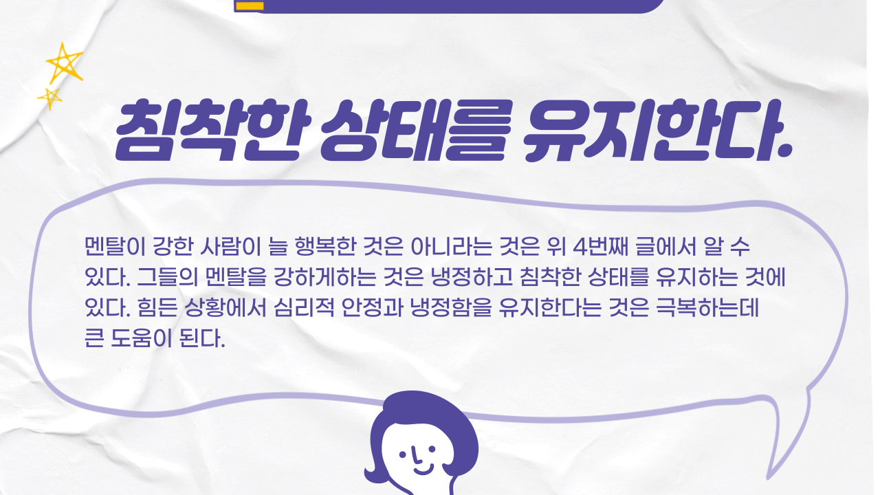 이렇게 멘탈이 강한 사람들은 어떠한 특징을 가지고 있으며, 어떻게 마음을 다스릴까요?