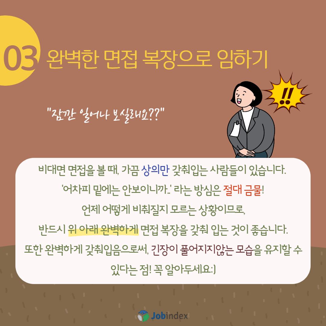 언제 어떻게 비춰질지 모르는 상황이므로 반드시 위 아래 완벽하게 면접 복장을 갖추는 것이 좋습니다.