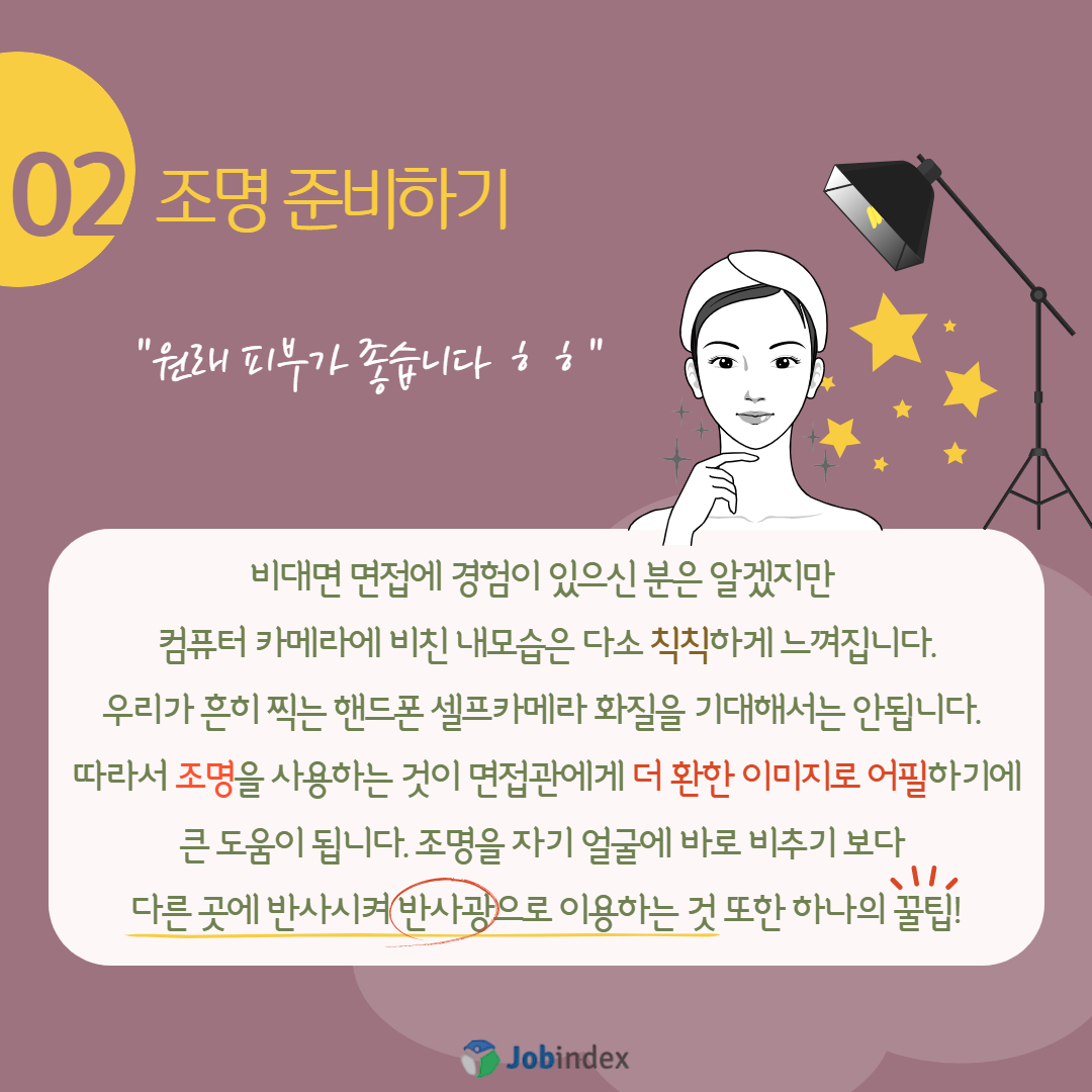 우리가 흔히 찍는 핸드폰 셀프카메라 화질을 기대해서는 안됩니다. 따라서 조명을 사용하는 것이 면접관에게 더 환한 이미지로 어필하기에 큰 도움이 됩니다. 조명을 자기 얼굴에 바로 비추기 보다 다른 곳에 반사시켜 반사광으로 이용하는 것 또한 하나의 꿀팁!