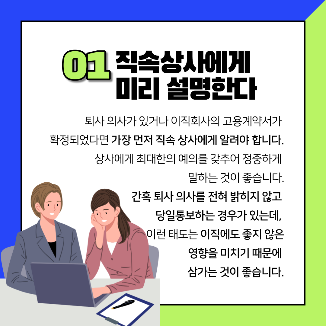 최소 한 달전에는 퇴사 의사를 전하는 것이 올바른 퇴직 매너!